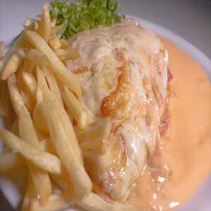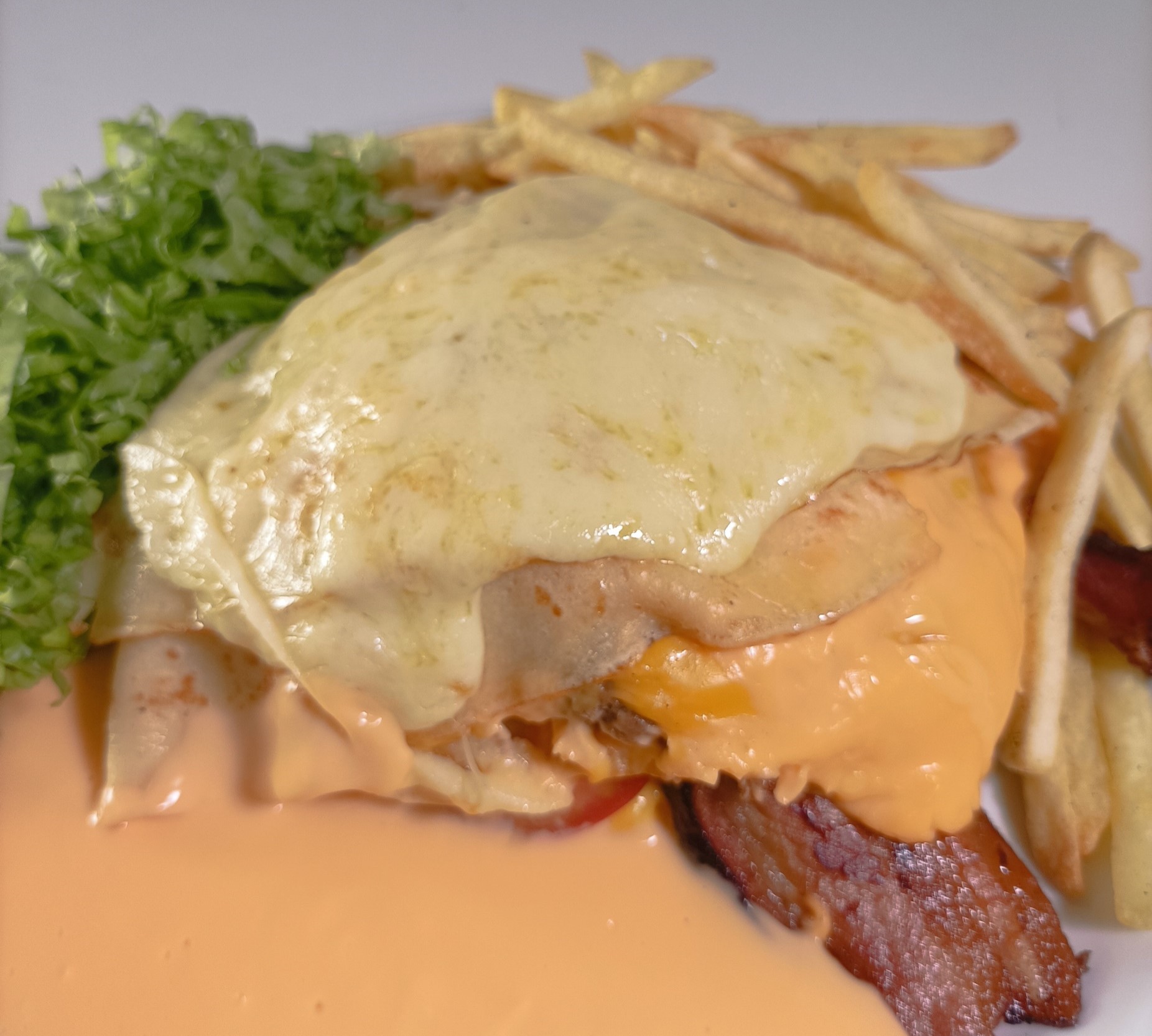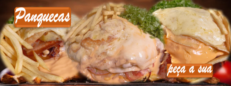 Panqueca, Hambúrguer da Casa , Queijo Muçarela, Queijo Cheddar, Bacon, Ovo e Tomate. Acompanha: Batatas Palito, Alface e Creme Cheddar.