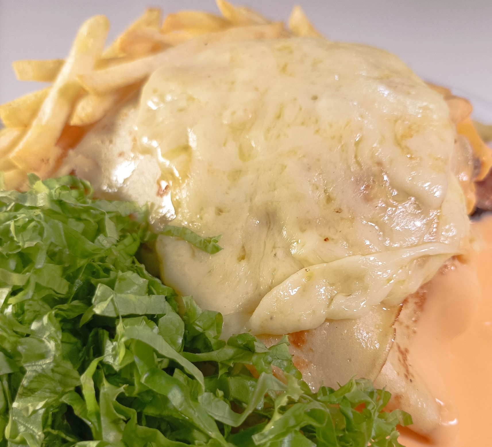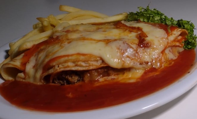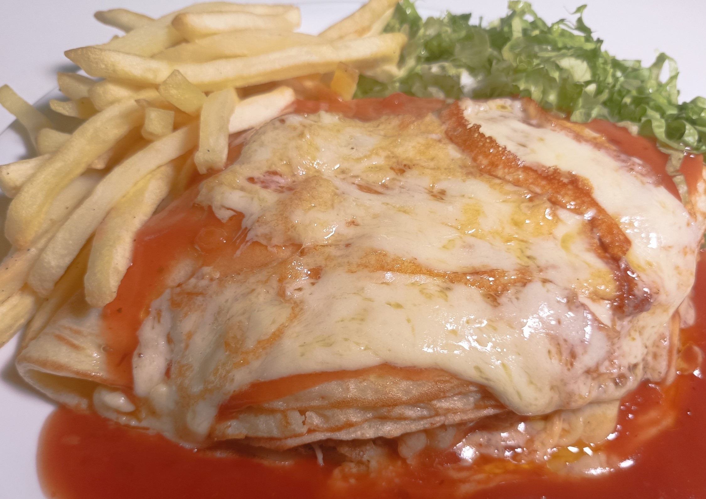 Panqueca, Contrafilé à Milanesa, Muçarela e Queijo Parmesão. Acompanha Batatas Palito, Alface e Molho de Tomate ao Sugo.